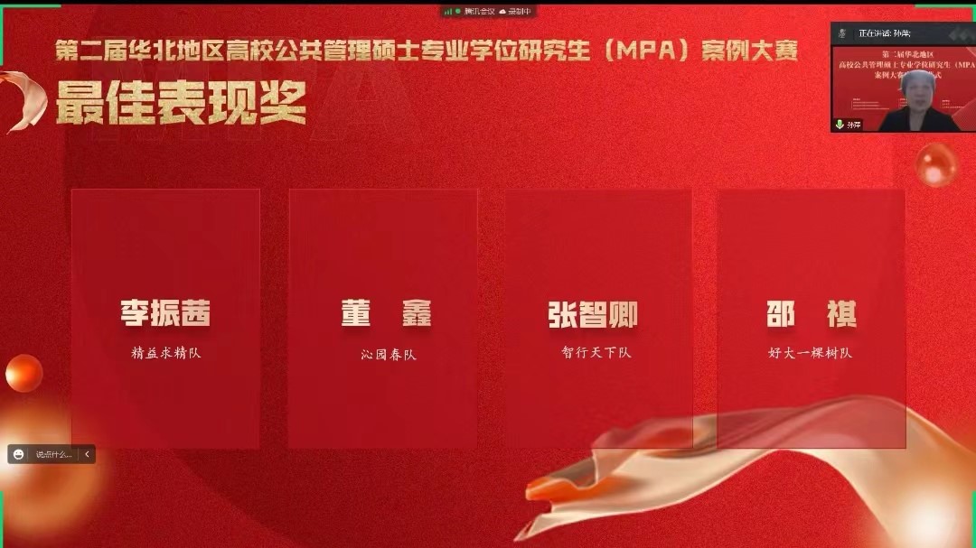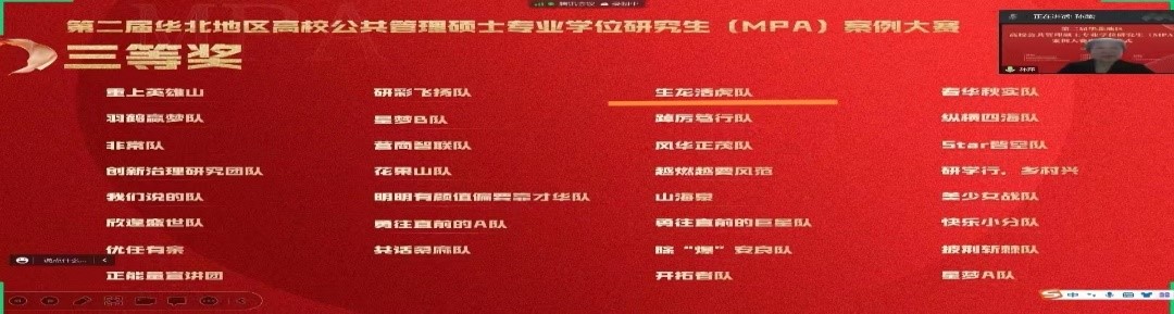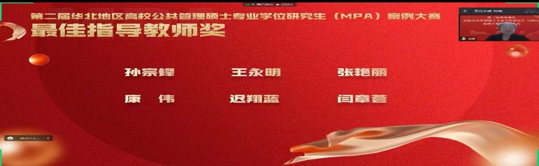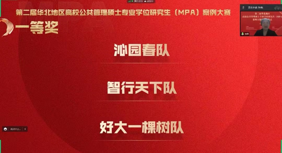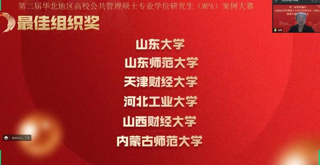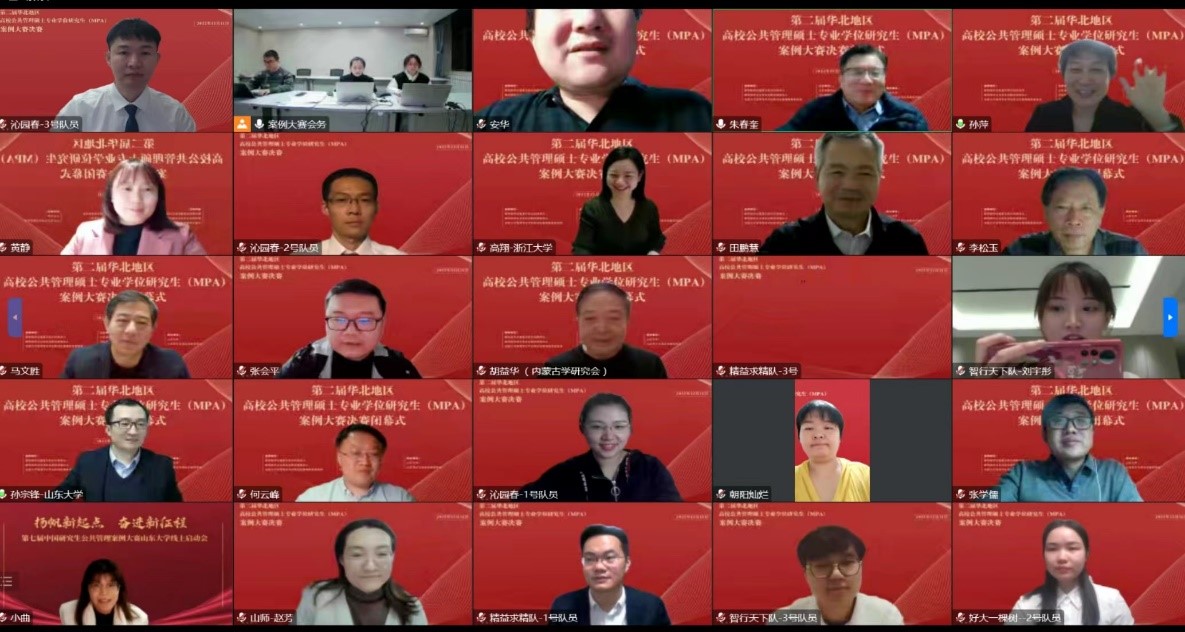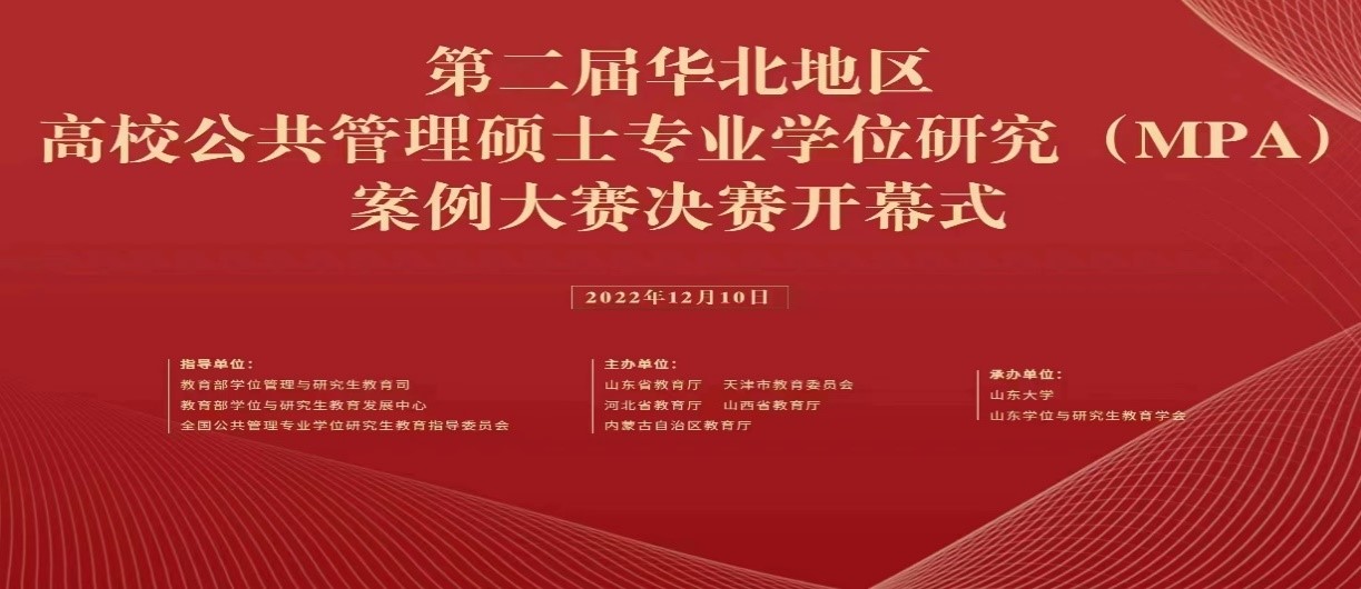 12月10日至11日,第二届华北地区高校公共管理硕士专业学位案例大赛决赛在云端开赛。本次大赛由教育部学位管理与研究生教育司、教育部学位与研究生教育发展中心和全国公共管理专业学位教育指导委员会指导,天津市教育委员会、河北省教育厅、山西省教育厅、内蒙古自治区教育厅及山东省教育厅主办,山东大学承办,大赛旨在贯彻党的教育方针,落实立德树人根本任务,深入贯彻落实《专业学位研究生教育发展方案(2020—2025)》(学位〔2020〕20 号)精神,深化教育改革创新,通过社会调研、案例撰写与分析等方式,提高公共管理学生运用相关理论和方法解决实际问题的能力,在MPA教育中进一步推广案例教学法,提高专业学位研究生人才培养质量。