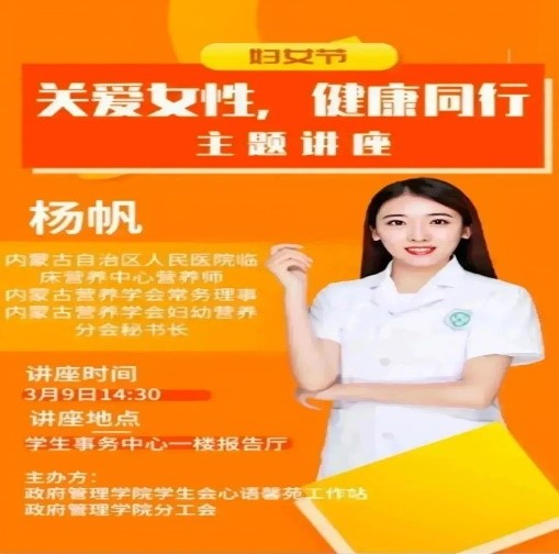 学生会心语馨苑工作站,于2023年3月9日在盛乐校区学生事务中心一楼报告厅举办了以“关爱女性,健康同行”为主题的妇女节健康知识讲座。